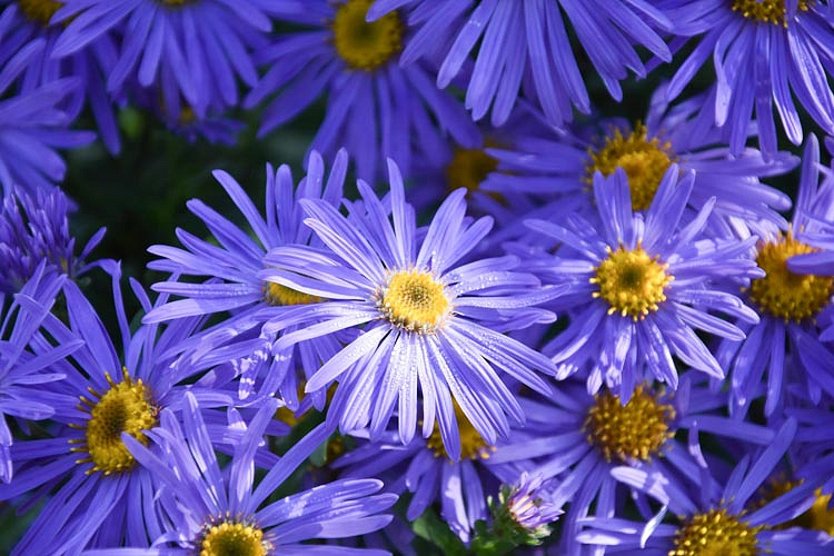 We count Asters among the great garden plants, because many of them bloom gloriously in late summer and fall when most garden plants are spent. There are many species, all of them having the classic Daisy form (outer ray flowers surrounding a central disk). They offer a range of rich colors, often with exceptionally handsome dark green foliage, easy dispositions, hardiness, and a ton of flowers at a time when color is at a premium. In addition, some Asters are among the longest-blooming plants known, the finest attribute a plant can have. Asters need full sun and reliable moisture, and often perform best if pinched in midsummer, which discipline produces a super-abundance of bloom on a plant precisely the size you want.