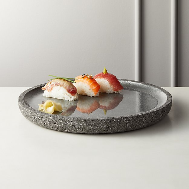 Gathered from the eruptions of volcanic mountains, thick round server makes for great conversation at table’s center. Stone is cut, shaped and polished before a clear resin and silver finish is applied. We especially love this as a sushi platter. Variation in color/activity/texture of stone to be expected. CB2 exclusive.