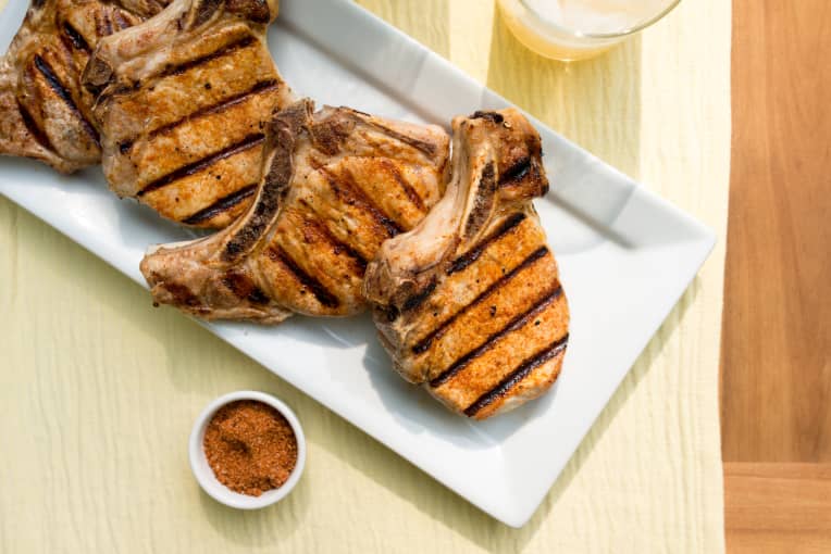 Brining doesn’t have to be elaborate or take a long time. Since these are chops and not a big bird like a turkey, even brining for 30 minutes does wonders, and that’s about how long it’ll take to heat up the grill. The chops can sit in the brine for up to two hours, but don’t go beyond that or the texture of the meat can get spongy. You can even brine individually frozen pork chops — just put them in the brine for the full two hours. They’ll be defrosted and ready to grill at that point.