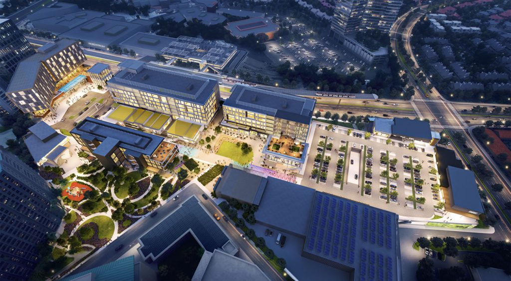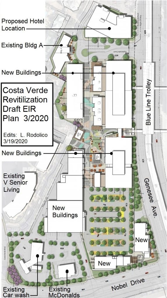 The Costa Verde Revitalization Project proposal includes hotel and office space as well as retail space; with parking and pedestrian areas. The project site is located on Genesee Avenue at Nobel Drive, on the northwest corner. There are some major differences with the new proposal compared to the existing layout. The proposal is a partnership between two developers – Regency Centers (shopping centers) and Alexandria (research and development office space). The project proposal includes 400,000 square feet of office space in 3 R&D buildings, a 200 room hotel, as well as 178,000 square feet of retail space. More details are available in the Fact Sheet, Overview, and in the 518-page EIR (links below).