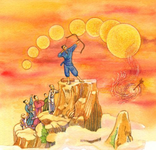 傳說從前天上有10個太陽。 太陽燒毀了地球上所有的植物和死於它的人。 然後有一天,一位名叫后羿的弓箭手用他的弓箭射落了十個太陽中的九個來拯救地球上的人類。 后羿因為勇敢,得到了一瓶長生不老藥。 他將此瓶交給妻子嫦娥保存。 可是,有一天,嫦娥不得不喝下這瓶靈藥,以免落入壞人之手。 長生不老藥讓她飛上月球,不死不滅。
