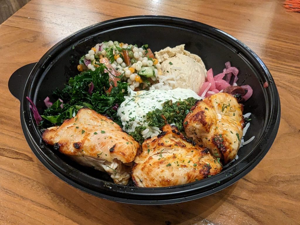 Pearled couscous, tzatziki, hummus, kale medley, pickled onions, schug, olives, basmati rice, and choice of protein.