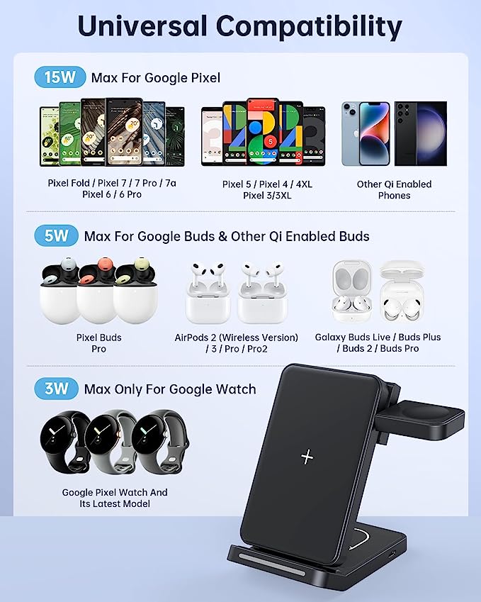 • 🔋【3 in 1 Pixel Wireless Charging Station】This foldable wireless charger stand can provide 15W Max for Google Pixel 7 Pro/7a/7, Pixel 6 Pro/6, Pixel 5, Pixel 4/4XL, Pixel 3/3XL, Pixel Fold; 3W Max ONLY for Google Pixel Watches, and 5W Max for Google Pixel Buds Pro. It’s also compatible with other brands of phones and buds that support wireless charging.