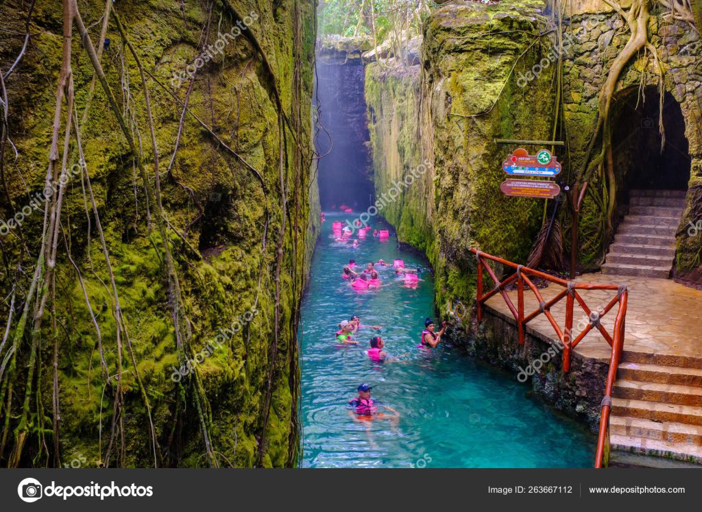 XCARET,MEXICO – APRIL 16,2019 : Underground river at XCaret park on the Mayan Riviera