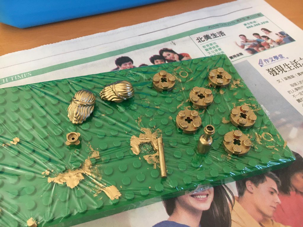 Building of the Buddha statues. Since Lego does not have a lot of golden pieces, most of the buddha statue parts has to be custom made and painted. Normally I would not paint the pieces, but this was the exception. The buddha minifigures also has to be customized. Lego does not have golden minifigures, however they do have golden minifigure key chains. The buddha minfigures was actually created from dis-assembling Lego keychains. Other hair and accessories has to be custom made and painted.