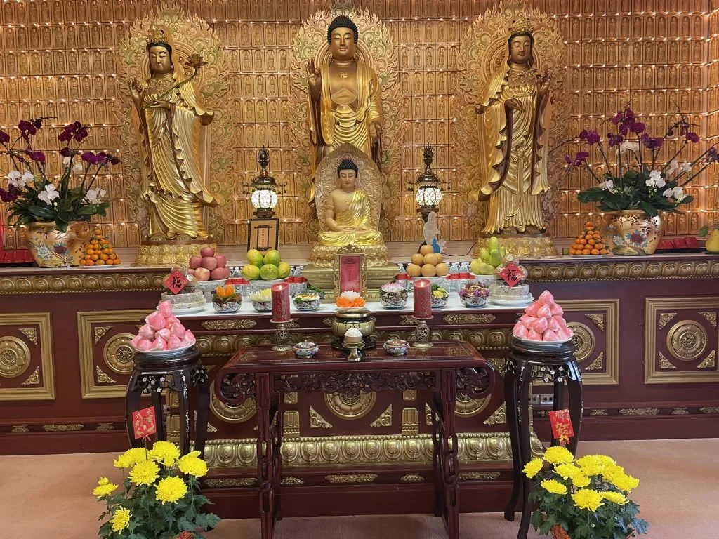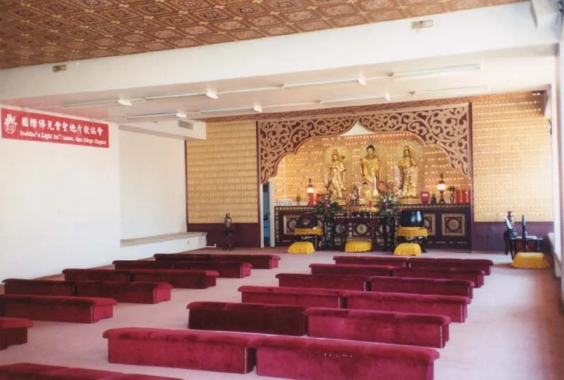 The second floor of the building is the main service hall where many of the temple’s prayer services are held. The main hall contains shrines where devotees follow the venerables in their chant of the prayer service.