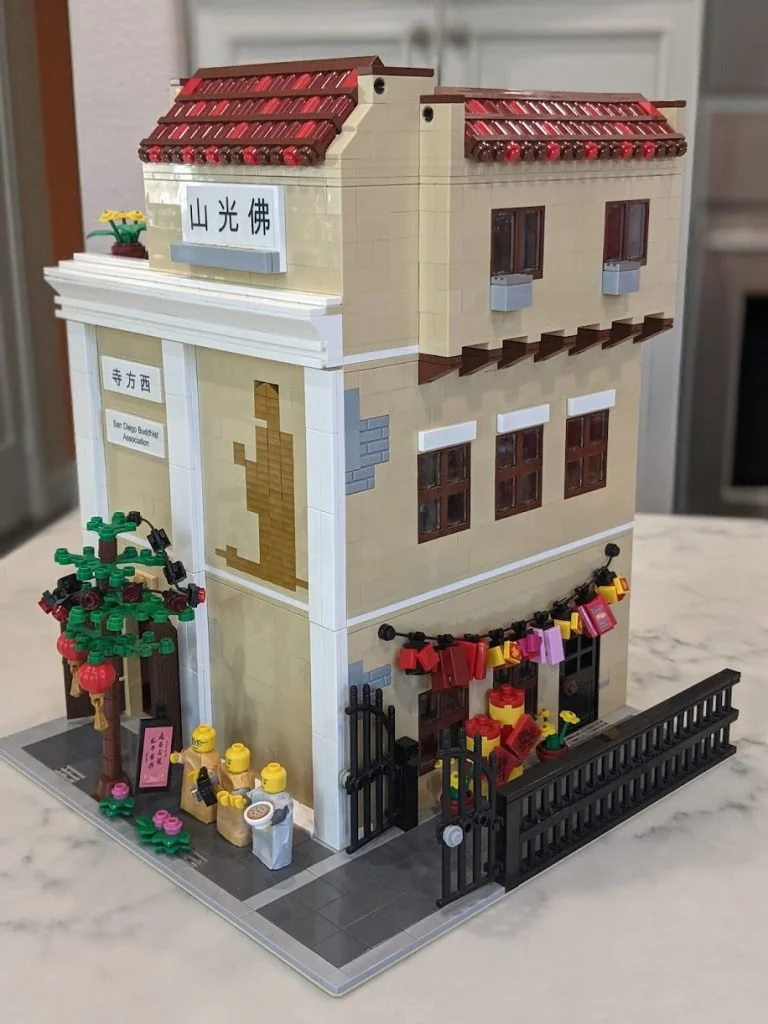 This set is a miniature replicate of the Hsi Fang Temple of the San Diego Buddhist Association in San Diego, California. This set (just like the real Hsi Fang Temple) has three floors. It has the distinctive icon on the front face of the building.