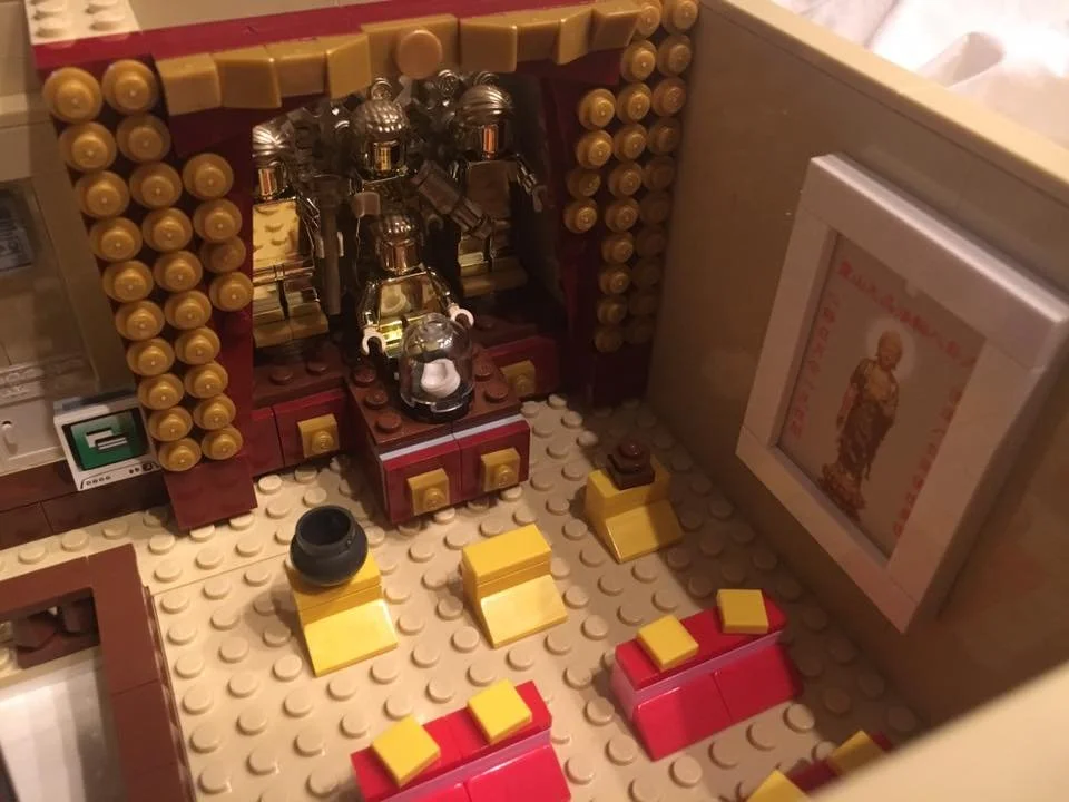 Building of the Buddha statues. Since Lego does not have a lot of golden pieces, most of the buddha statue parts has to be custom made and painted. Normally I would not paint the pieces, but this was the exception. The buddha minifigures also has to be customized. Lego does not have golden minifigures, however they do have golden minifigure key chains. The buddha minfigures was actually created from dis-assembling Lego keychains. Other hair and accessories has to be custom made and painted.