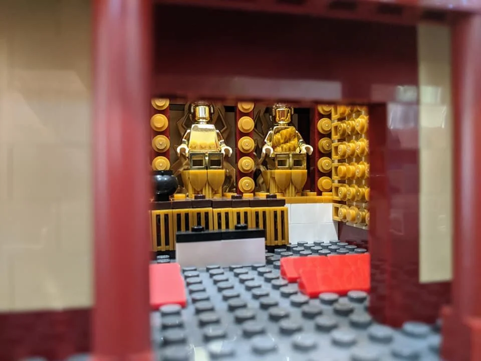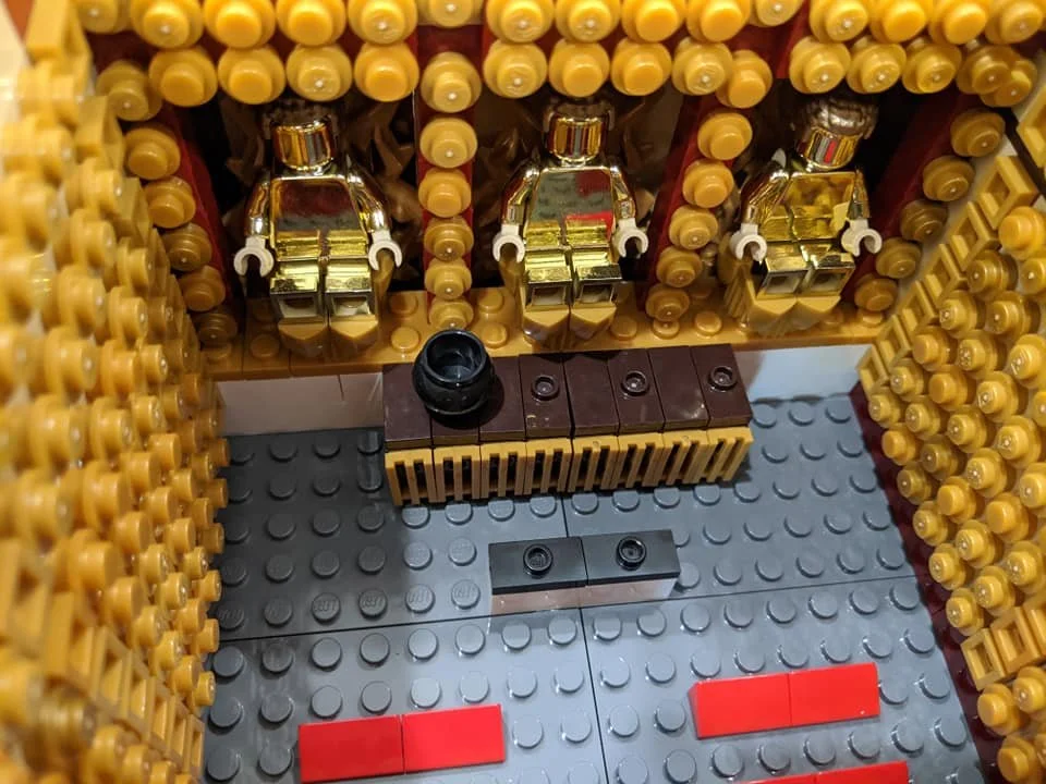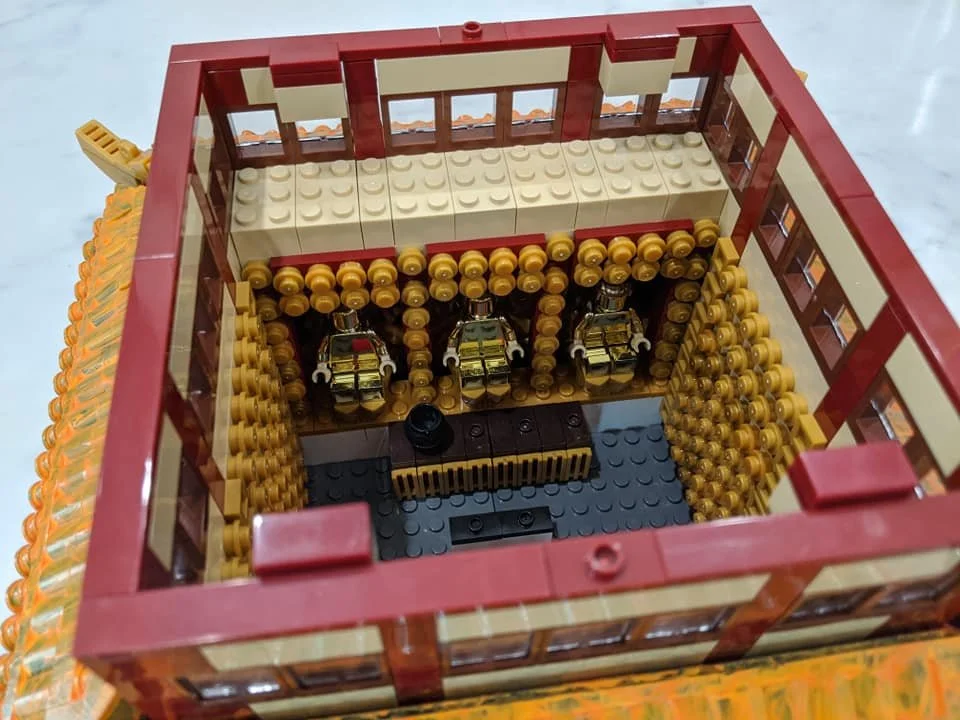 This set also features an inside that mimics the real inside of the prayer service hall. This set features the three main shines and the hall’s beautiful chandelier lighting. The walls of the main prayer hall are surrounding by golden buddha icons.