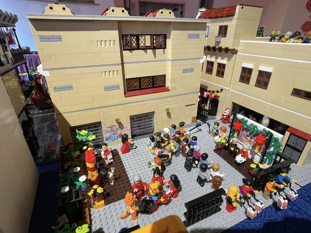 This display includes the University Heights sign and the blue street lights with banner. The streets are decorated with red lanterns and LNY banners. Various Lego minifigures line the streets.